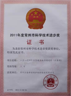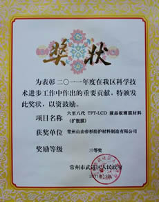 年,常州山由帝杉防护材料制造有限公司研发工作取得积极进展,《纳米ATO材料隔热窗膜制造技术的研究与开发》项目获武进区科技进步三等奖,《六至八代TFT-LCD液晶板薄膜材料》项目分别获得武进区和常州市科技进步三等奖。