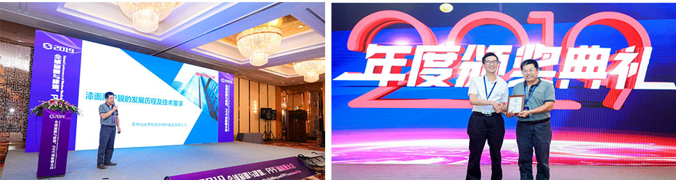 8月8日-9日,山由帝杉受邀参加2019全球窗膜与建筑、PPF功能膜大会,王舟浩董事长作为特邀嘉宾,针对漆面防护膜的发展历程、性能指标要求及应用前景等发表了“漆面防护膜的发展历程及技术要求”的主题演讲;作为窗膜行业的杰出代表,山由帝杉被授予“2019年度行业最具品牌成长力奖”。