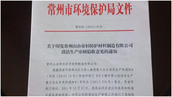 近日,常州市环保局印发通知,同意常州山由帝杉防护材料制造有限公司通过清洁生产审核。