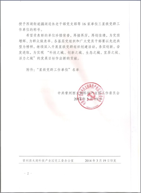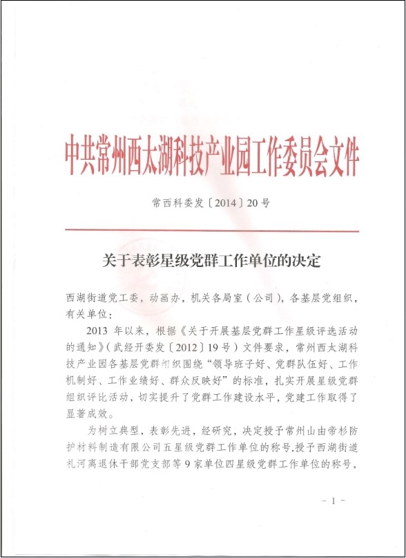 3月20日,常州西太湖科技产业园(武进经发区)召开党建工作会议,回顾总结2013年度党建工作成绩,安排部署园区2014年度党建工作任务。大会表彰了2013年度星级党群工作单位,山由帝杉公司作为^一家“五星级党群工作单位”受到表彰。2013年度,公司通过“加强组织建设,形成长效机制;开展主题活动,服务生产经营;建设企业文化,筑牢发展根基;关心员工生活,凝聚员工心智”等举措,不断提升党群工作水平,先后获得常州西太湖科技产业园“四星级党群工作单位”、“先进党组织”,武进区 “和谐文化建设标兵企业”、“五好企业党组织”,常州市“五一劳动奖状”、江苏省 “模范职工之家”等多项荣誉称号。
