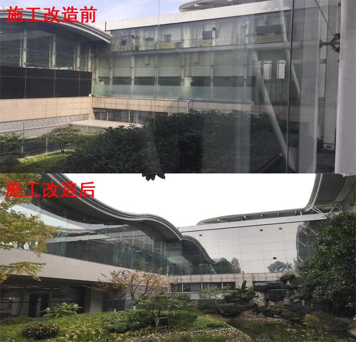 该项目要求既不影响楼内采光,又能恰到好处地遮挡部分视觉污染,同时兼具安全防爆功能,施工难度大,T1庭院内遍布绿植、石头以及其他景观设施,且地面与施工层高差大,为保证施工安全,公司与机场航站管理处对施工方案进行反复优化,^终选择内外、贴相结合的施工技术和办法。期间还协调楼内驻场十余家单位及商户,确保工程能顺利推进。